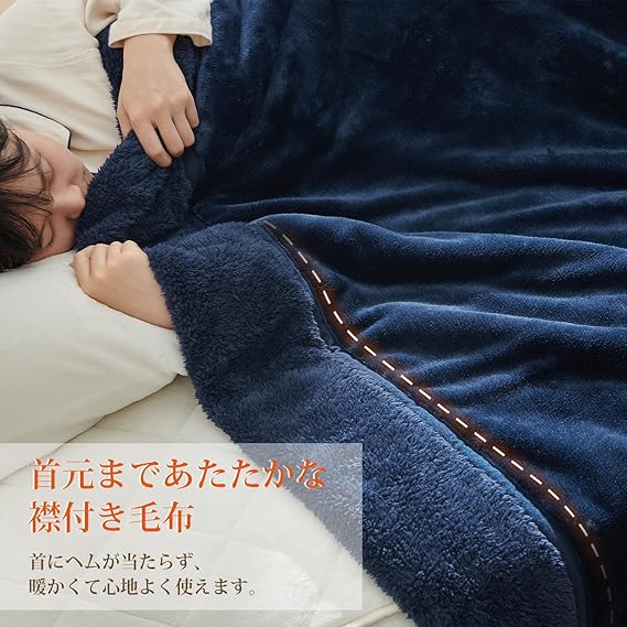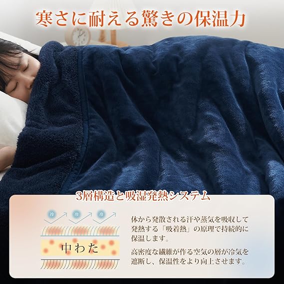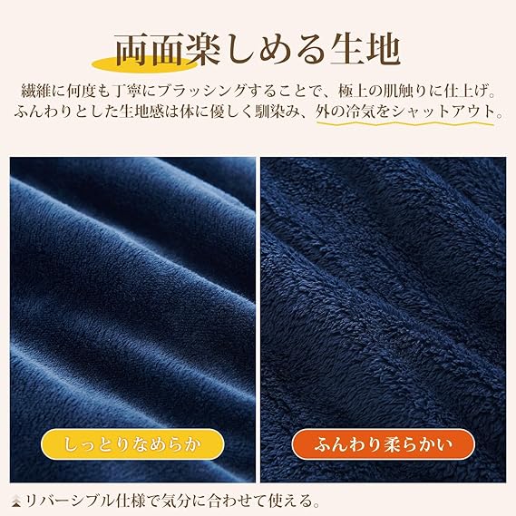 「魅力的な肌触り」なめらかな肌触りの毛布で、吸湿発熱中綿とふんわり柔らかいフランネルの三層構造が、贅沢な暖かさを提供します。襟付きで首元も快適、触って心地よく、至福のひとときを感じられます。