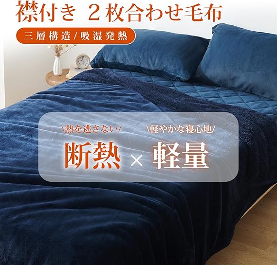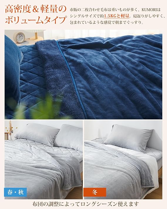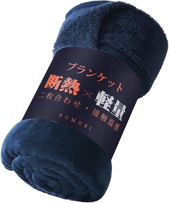 クモリ(Kumori) 2枚合わせ 厚手 毛布 シングル 冬用 あったか 中綿入り 襟付き ブランケット フランネル 三層構造 吸湿発熱 もうふ 保温 軽量 ふわとろ 掛け毛布 洗える 毛抜けない 静電気防止 暖かい ボリュームタイプ 合わせ毛布 ネイビー 140X200cm