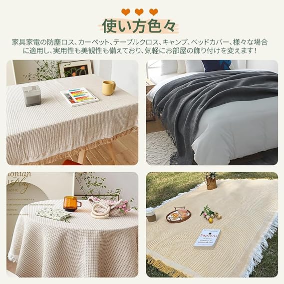 JEMAジェマ ソファーカバー 北欧風 マルチカバー テーブルクロス ソファカバー ベッドカバー 長方形 ブランケット 綿混材? リバーシブル 毛布 無地 保護カバー 防塵 キズ防止 汚れ防止 洗える 四季通用 柔らかくて軽く 吸湿 通気 速乾 ベージュホワイト・ワッフル柄 340×180cm(3-4人掛け)