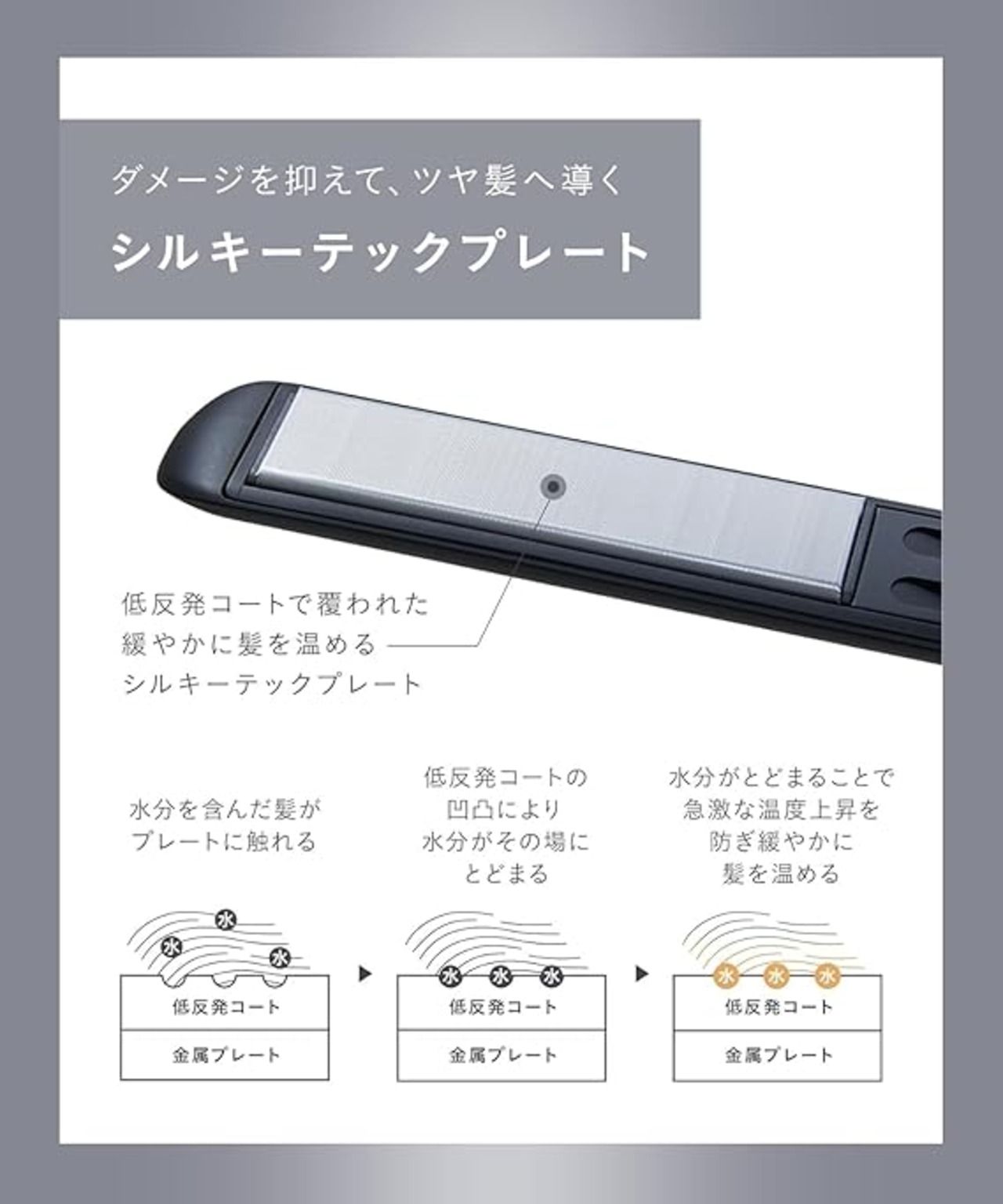 【シルキーテックプレート】緩やかに髪を温め、髪に優しく艶めくスタイリングに。