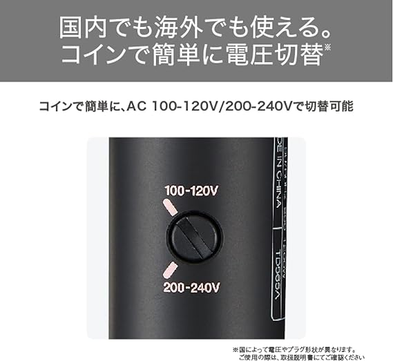 地域の電圧に合わせて、コインで簡単にAC 100-120V⇔200-240Vと切替えられます。また、従来機種より風量が1.4m3/分(JIS規格)※1にアップしました※2。 ※1:DRY時。120V/240V時。JIS規格測定法による ※2:従来機種BID40と比較