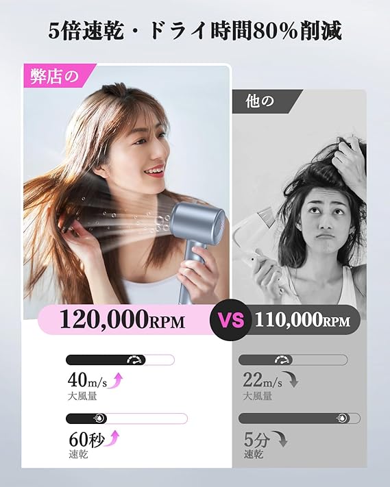 【高風速ドライヤー・速乾】高速のブラシレスモーターモーターが内蔵され、毎分120,000回の高速回転を生成、大風量で40m/sのパワフルな風を送ります。濡れた髪は乾いた髪より弱いため、髪のダメージを防ぐためにすばやく乾かすことが重要です。Bopwavy高風速ドライヤーは髪に熱を当てる時間が短くなり、頭皮と髪を守ります。