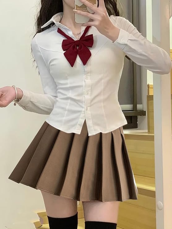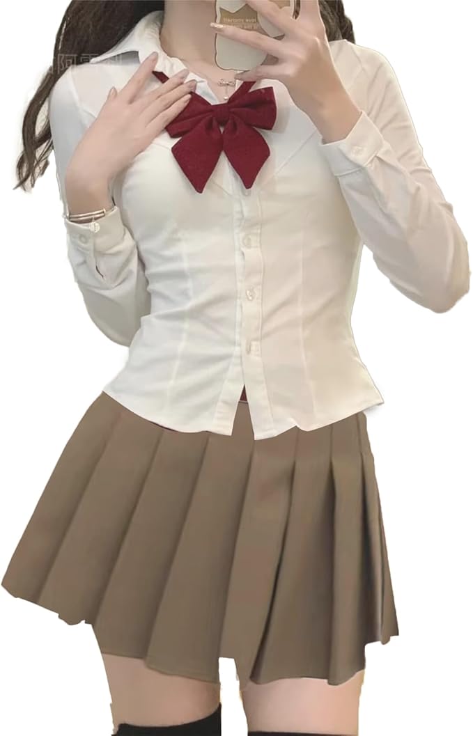 [Wuzfully] 制服 コスプレ 女子高生 3点セット JK セーラー服 大きいサイズ 長袖シャツ スカート リボン コスチューム ハロウィン 写真撮影 パーティー衣装 卒業式