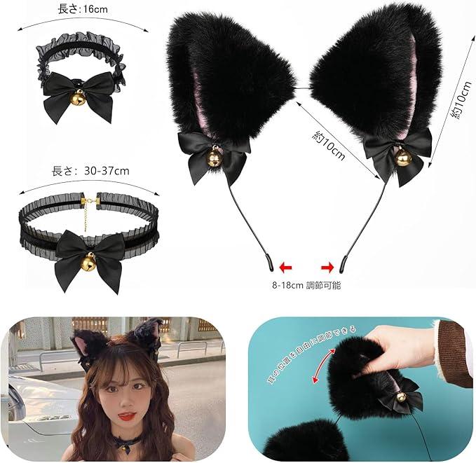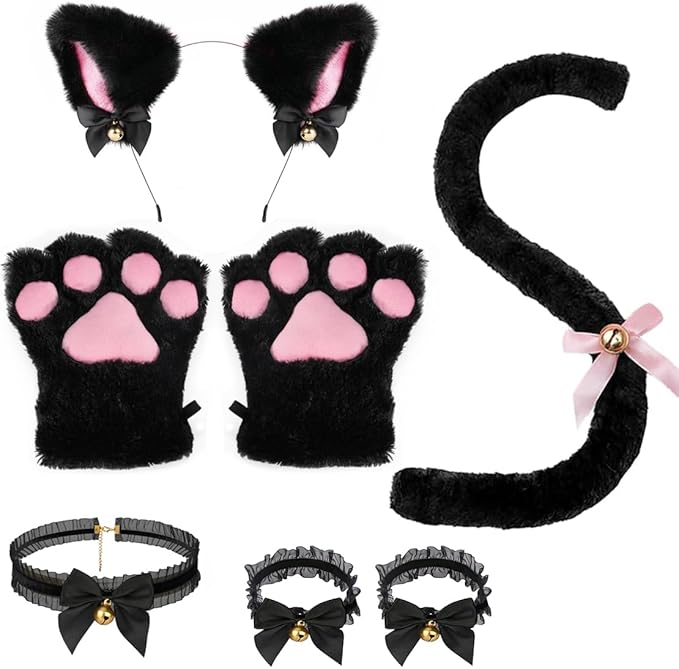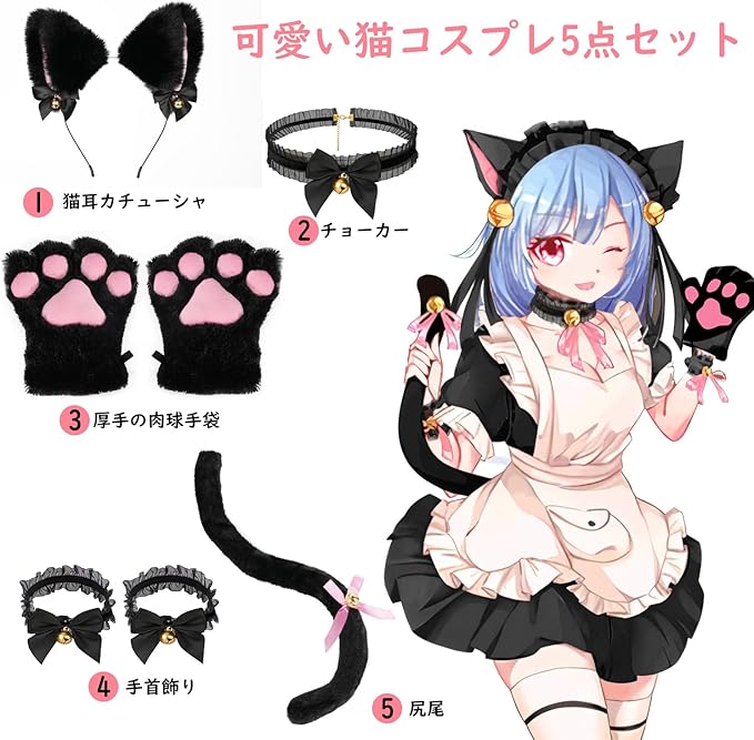 Sucodver 猫耳 カチューシャ 肉球手袋 尻尾 チョーカー 手首飾り 厚手 鈴付き ふわふわ ハロウィン コスプレ 小物 5点セット
