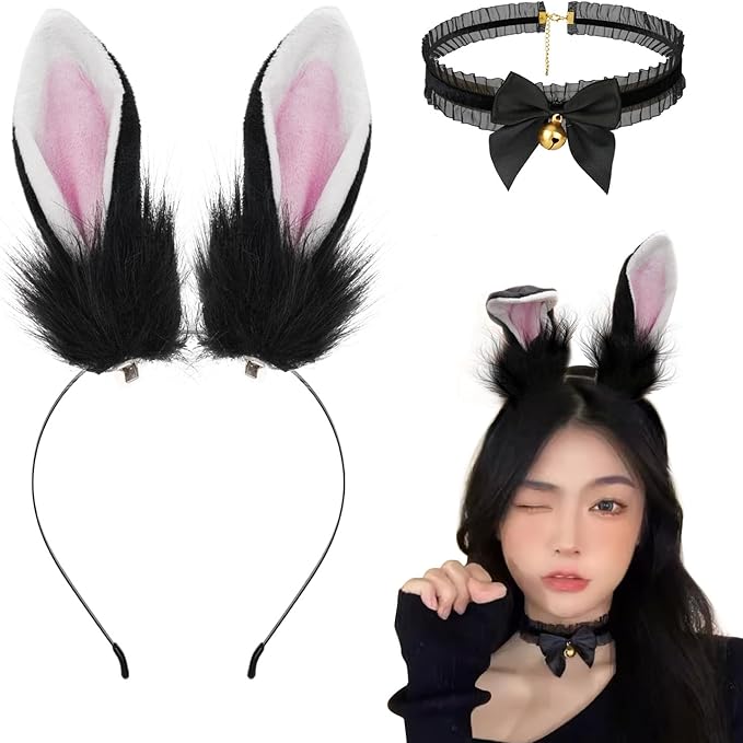 ANZOBEN うさ耳 カチューシャ うさぎ耳 うさぎ チョーカー カチューシャ 鈴付き ウサギ コスプレ 仮装 小物 ユニセックス 2点セット 黒×ピンク(ブラック)