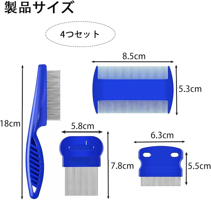 【仕様】:ペット用櫛4点セット、セットには4つの異なるサイズの櫛が入っている。