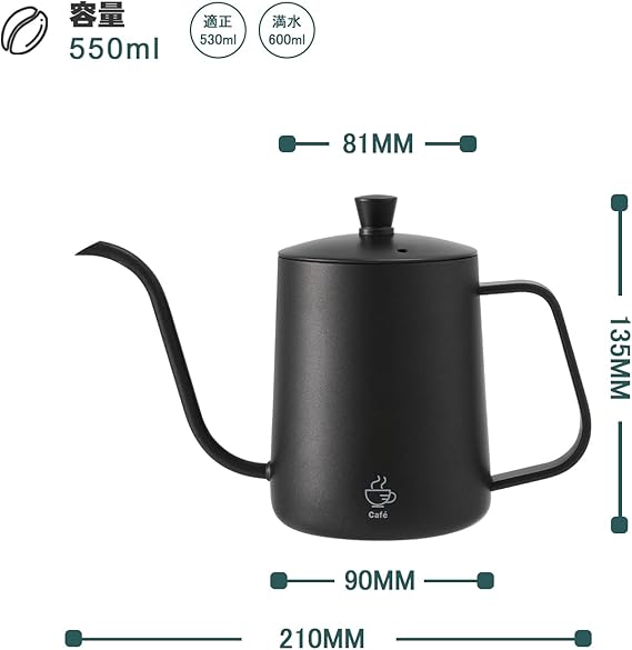 【商品仕様】サイズ:215x135x90mm 。注ぎ口内径: 6mm 材質:304ステンレス鋼(ハンドル部分も金属製のでやけどご注意ください)満水容量: 600ml 適正容量: 500ml 重量: 389g (注意:電磁調理器(IH調理器)と直接ガス火に使用できませ。)