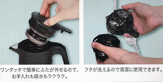 材料の種類:本体内側/ステンレス鋼、本体外側/ステンレス鋼(アクリル樹脂塗装)、口がね・ハンドル/ポリプロピレン、ふた栓/ポリプロピレン、プッシュレバー/ABS樹脂、開閉ボタン/ポリアセタール、パッキン/シリコーンゴム
