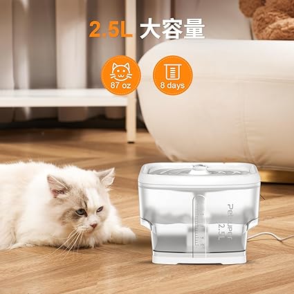 【2.5L大容量】:猫水飲み器は食品級ABS材質採用で、丈夫で耐久性も良いです。透明タンクで残量がひと目でわかります。たっぶり2.5Lを貯水できるので多頭飼いやお留守番も安心です。万が一、電源がきれても、蓋は一匹の猫の1日分(約120ml)の水量を貯めます。