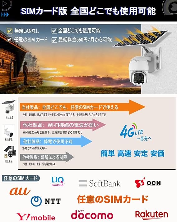 【SIMカード版(Wi-Fi接続不要)】 日本全国どこでもで使用可能の防犯カメラ。 スマートフォンの専用アプリで映像確認出来る屋外監視カメラ。 公園、駐車場、農場、富士山山頂などでも使える便利な太陽光発電カメラ。 Wi-Fi接続不要で、ご利用キャリアのサービスエリア内であればどこでも使えます。 Au、Docomo、Softbank、楽天モバイル、Ymobile、UQモバイルなどすべての格安SIMカード対応。(OCNモバイルなら月額たったの550円から使用できるので、お試しでご利用いただくことも)