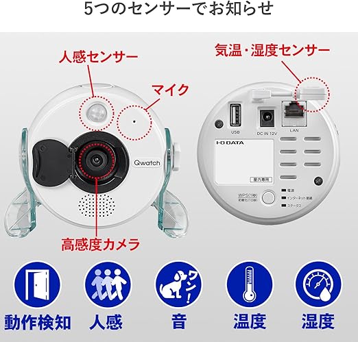 [特長] 人感、温度、湿度、音センサー対応でペットや子供の見守りに最適。録画用microSDカード付(4GB) 。