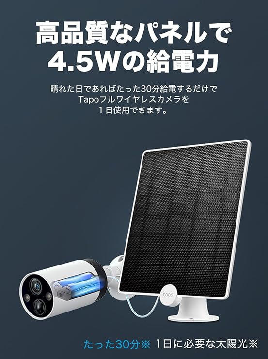 [特徴] エコで手軽。Tapoのフルワイヤレスネットワークカメラをクリーンな太陽光で給電すれば、充電時期や電気代も気にすることなく、より便利で安定したセキュリティ対策を実現できます。