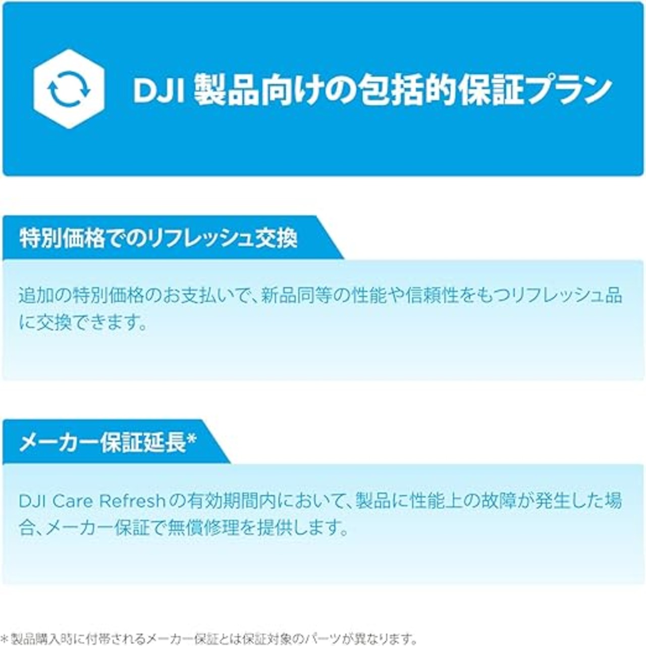 DJI公式保証プラン:DJI Care Refreshのサービス期間中、主要部品は引き続き公式保証の対象となるため、製品をより長く安心してご使用いただけます。