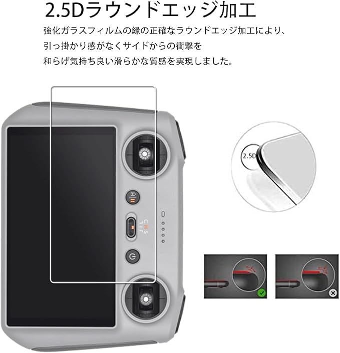 【対応機種】DJI Mini 4 pro/Air 3/Mavic 3 Pro/Mini 3/Mini 3 Pro/Air 2S RC/RC 2 リモコンアクセサリー 送信機 専用ガラスフィルム。【注意】この電話の画面の端は湾曲しているため、保護フィルムのサイズが丁度良い場合、しっかりと貼り付けられず、白いエッジやシェルとの干渉などの問題があるため、保護フィルムは画面よりも小さいです。
