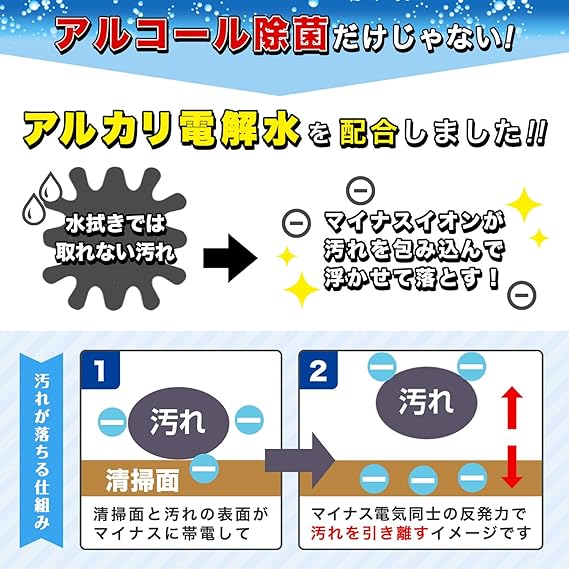 水拭きでは取れない汚れを、アルカリ電解水のマイナスイオンが包み込んで浮かせて落とします。