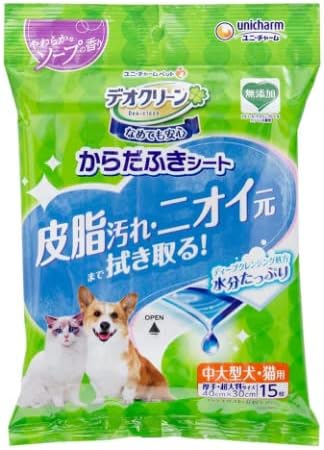 ユニ・チャーム 【セット販売】デオクリーン からだふきシート 中大型犬・猫用 やわらかなソープの香り 15枚×2コ
