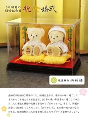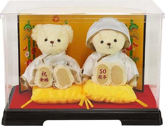 金婚式は結婚50周年のこと。金婚式を迎える夫婦は、早く結婚していても70歳前後。 その為夫婦ではなく、子供や孫、友人といった周りの人達からプレゼントするのが一般的です。 50年の長い年月を共に過ごして来たお二人に、尊敬と祝福の気持ちを込めて「おめでとう」。 そして両親が出会って結婚してくれたことに「ありがとう」。 あの頃の想い出がよみがえる、結婚当初の二人の姿を映し出したサプライズを贈りましょう。この金婚ベアは、プティルウの地元の氏神鎮守社である「蟻通神社」にて 夫婦円満をご祈祷頂いたものです。