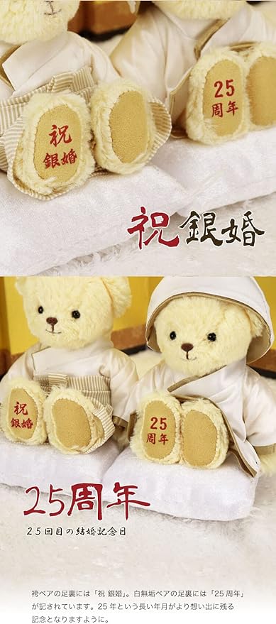 銀婚式は結婚25周年のこと。銀婚式を迎える夫婦は、早く結婚していても50歳前後。 愛する奥様へのプレゼントはもちろん、夫婦だけではなく子どもや友人といった周りの人達と一緒にお祝いするのも喜ばれます。 25年の長い年月を共に過ごして来たお二人に、尊敬と祝福の気持ちを込めて「おめでとう」。 そして両親が出会って結婚してくれたことに「ありがとう」。 あの頃の想い出がよみがえる、結婚当初の二人の姿を映し出したサプライズを贈りましょう。この銀婚ベアは、プティルウの地元の氏神鎮守社である「蟻通神社」にて 夫