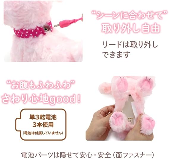 【遊び方】電池を入れてリードをつけて、おなか側のスイッチをONに。