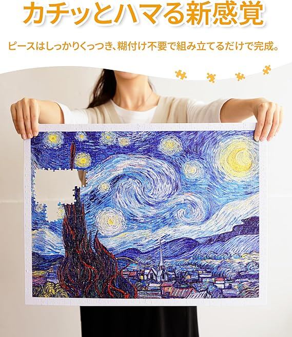 【しっかりと繋がり】「糊付け・乾燥・掃除」全て不要→従来の厚紙製のピースと異なり、ピース同士がしっかりと繋がるため、出来上がったパズルを簡単に移動させることができます。糊付けせず、