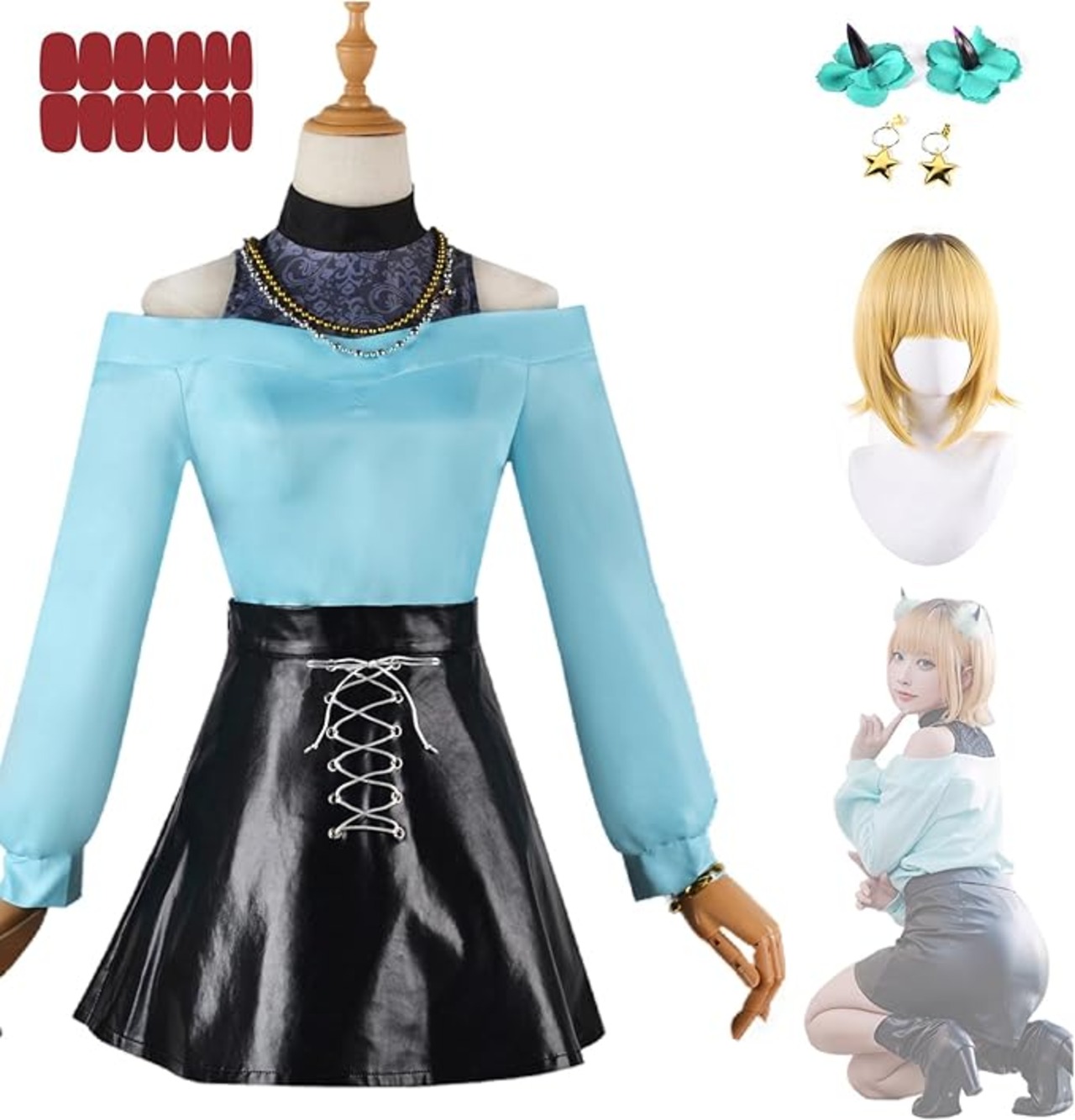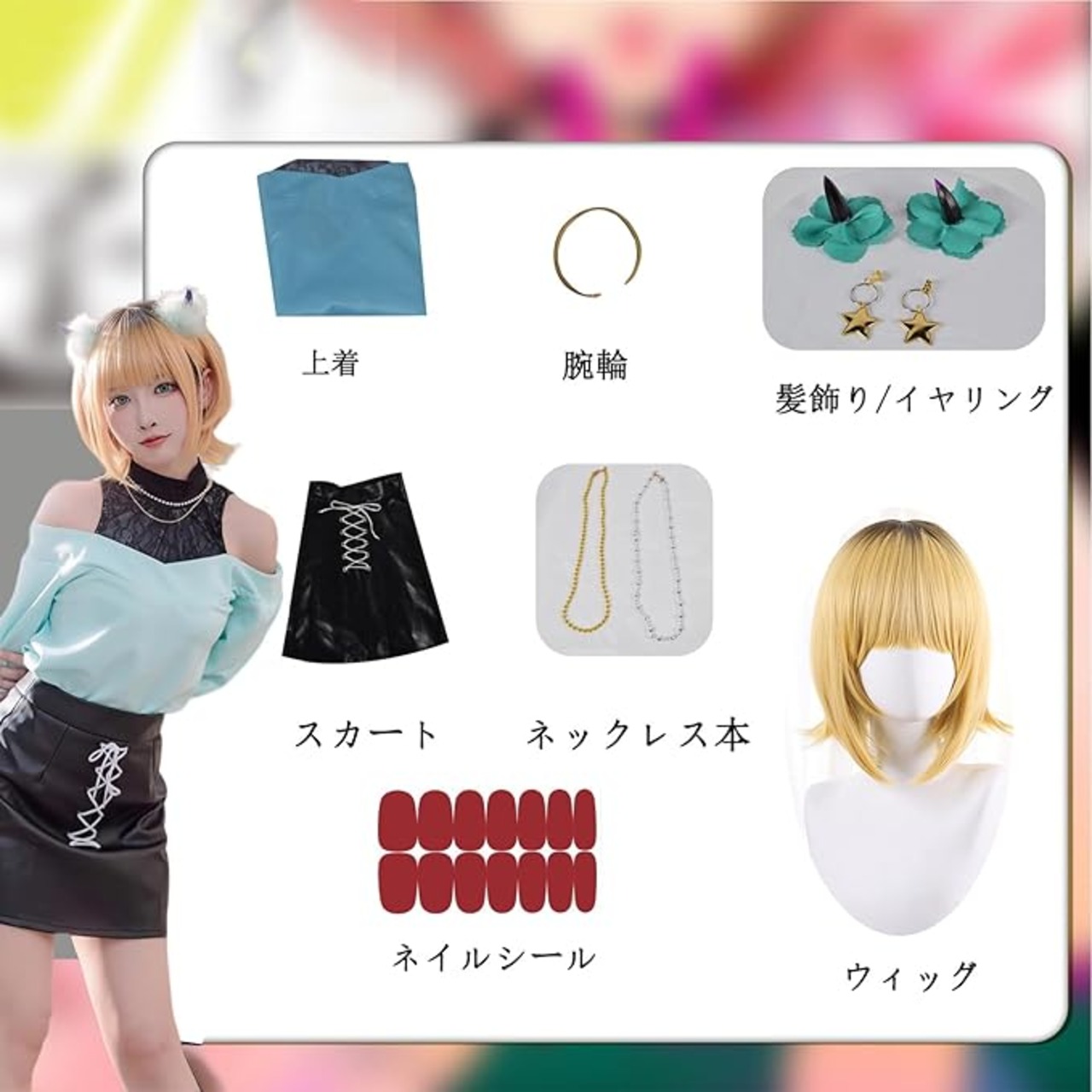 【セット内容】:MEMちょ 全セット コスプレ衣装 + ウィッグ + 髪飾り + アクセサリー 。