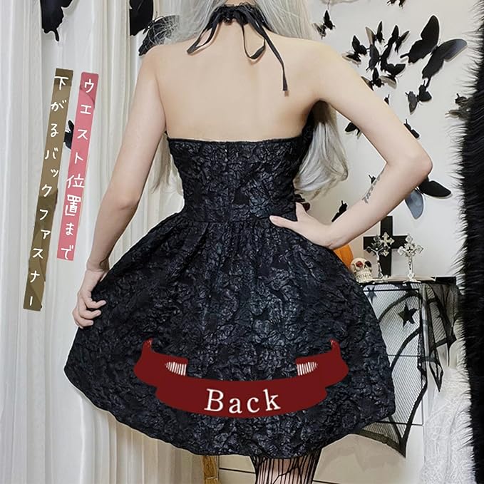 [QOOLY?] コスプレ ハロウィン ワンピース レディース ゴシック 黒 ブラック ゴスロリ ロリータ JSK ノースリーブ コスチューム 仮装 衣装 小悪魔 魔女 吸血鬼 衣装 大人 パーティー イベント