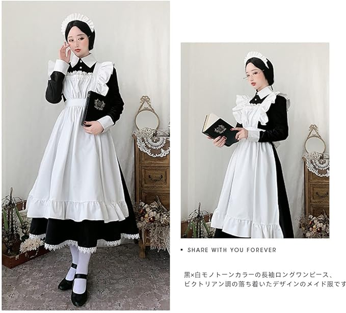 [JUNDOMECY] 英國風 メイド服 ロング ワンピース 長袖 半袖 上質 クラシカル ロイヤルメイド 可愛い メイド コスプレ 衣装 エプロン フリル カチューシャ 黒 白 大きいサイズ ハロウィン 仮装 喫茶店 変装 パーティー イベント