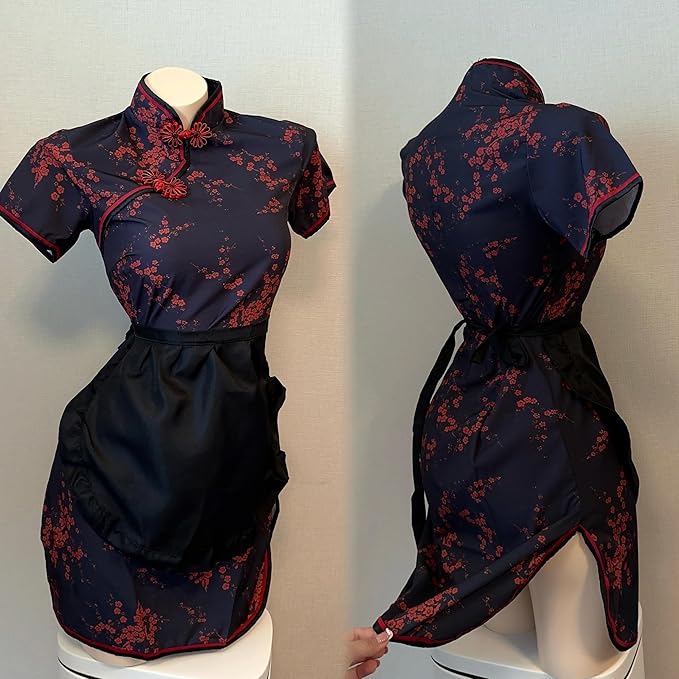 [Rhowena] チャイナ服 メイド服 コスプレ アニメ ブルー ドレス 制服 白い エプロン ロリータ 衣装 可愛い レディース ハロウィーン パーティー 3点セット Chinese Dress Maid Outfit Cosplay