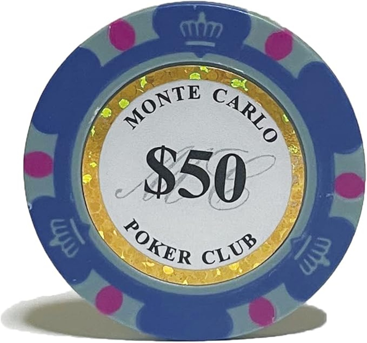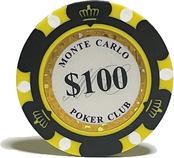 チップサイズは約:直径40mm×厚さ3.4mm、重さ14g (各20枚 1$、5$、25$、50$、100$)